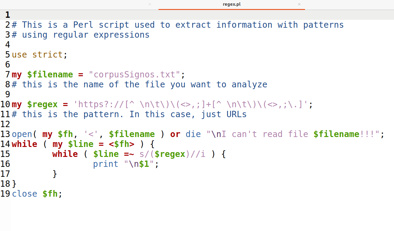 This is a very simple Perl script that opens a text file and prints lines or segments based on a regular expression provided by the user.